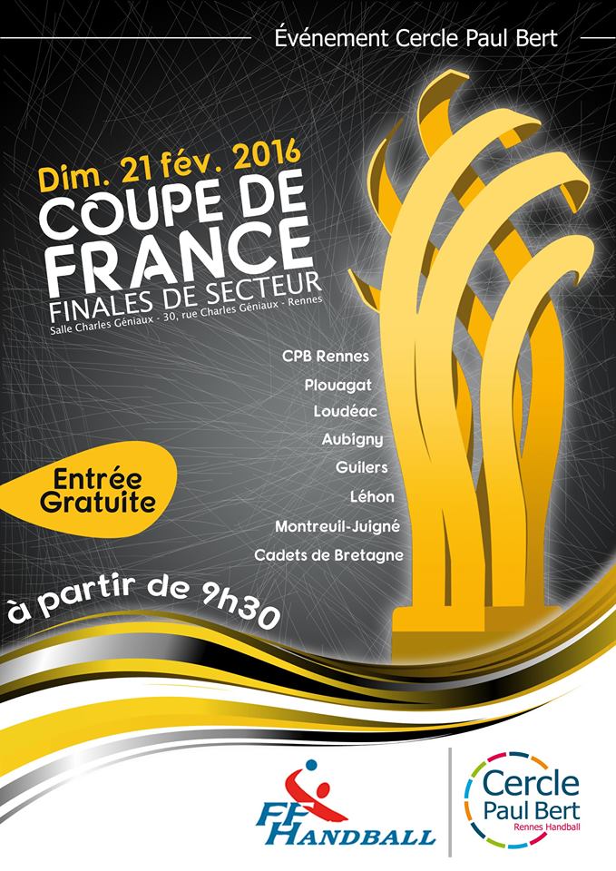 Le dimanche 21 février prochain, le CPB Rennes Handball accueille les finales de secteur de la Coupe de France Régionale à la salle Charles Géniaux. Encore en lice en Coupe de France, nos seniors féminines rencontreront Loudéac en 16e de finale à 12h30 !